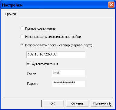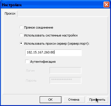 Если Вы используете для работы с Интернет прокси-сервер, то Вам необходимо зайти на вкладку "Прокси" и настроить тип прокси соединения и параметры: